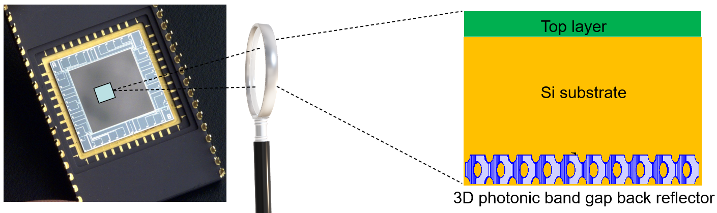 Figure 4: Schematic of a thin charge-coupled device (CCD) whose absorption could also be enhanced by a 3D photonic band gap back reflector. Hence, such a CCD becomes more efficient at collecting light.